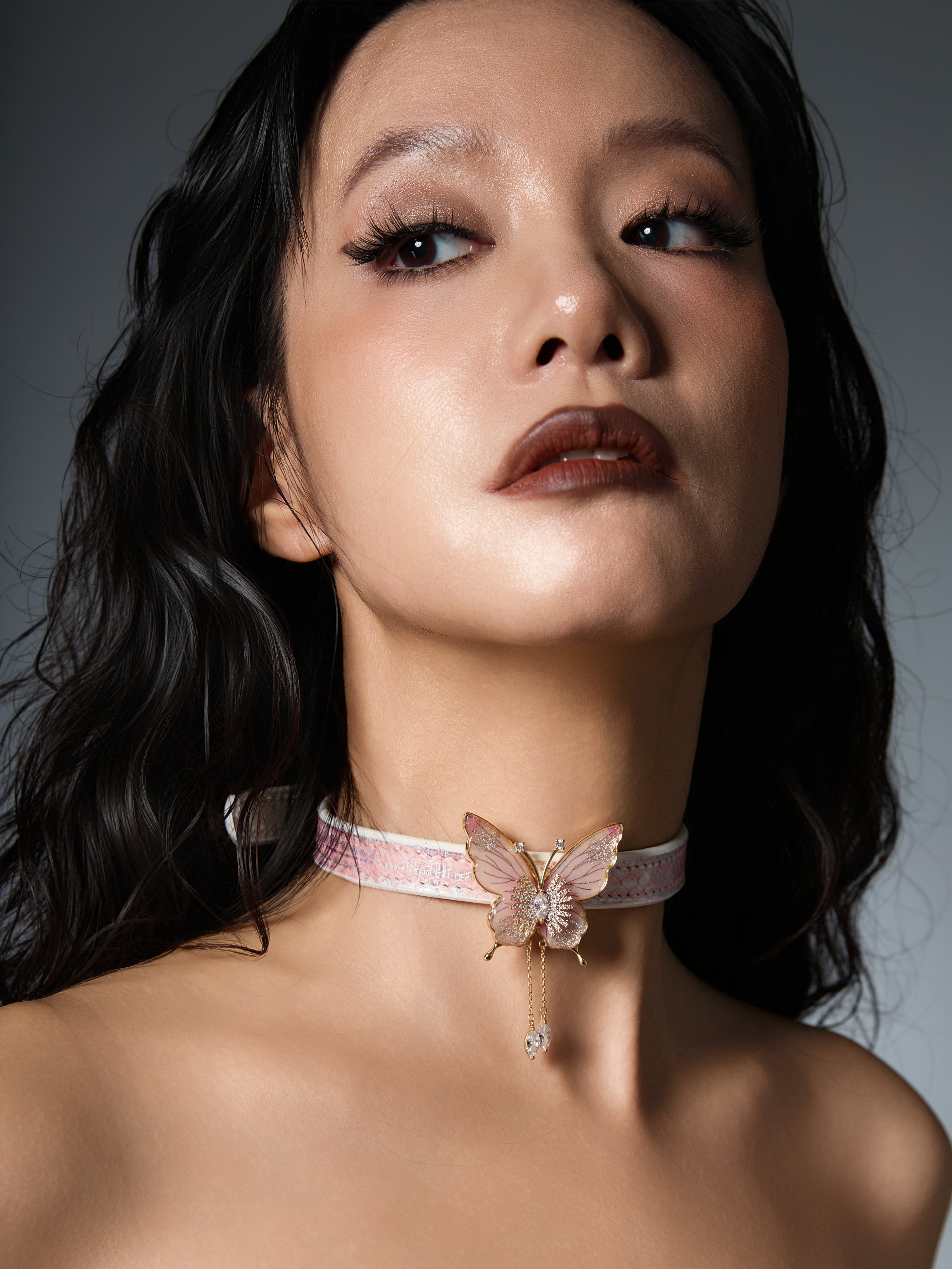 A delicate reverie in pastel tones, Hibiscus Butterfly enchants with its ethereal elegance and luminous detailing. The collar features an exquisite band of pale pink python skin, its naturally iridescent scales enhanced by a soft sheen and intricate texture. Framed in velvety white French lambskin, this piece embraces the neck with cloudlike suppleness. At its heart, a sculpted butterfly unfurls enamel-tinted wings, its body studded with glimmering pearls and flanked by twin teardrop crystals suspended from golden chains—like morning dew glistening on flower petals. An ode to innocence with a whisper of mischief.